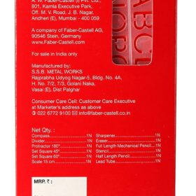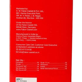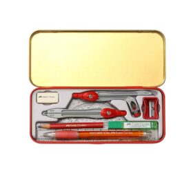 - Contains: 1 compass, 1 divider, 1 set square 45°, 1 set square 60°, 1 scale (15cms), 1 protractor 180°, 1 small mechanical pencil , 1 eraser, 1 sharpener