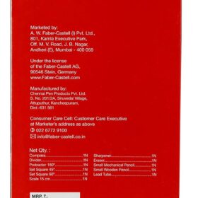 - Contains: 1 compass, 1 divider, 1 set square 45°, 1 set square 60°, 1 scale (15cms), 1 protractor 180°, 1 half length wooden pencil , 1 eraser, 1 sharpener,